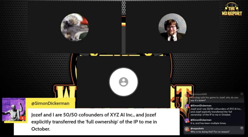 Simon Dickerman made an appearance in the chat on The W2 report and made a very critical statement regarding his position in XYZAI, possibly with reference to the assignment of the SSRWives IP inside the corporation.
